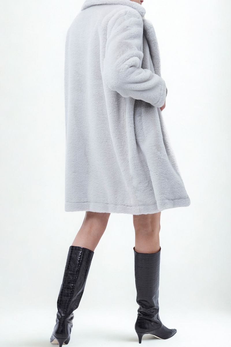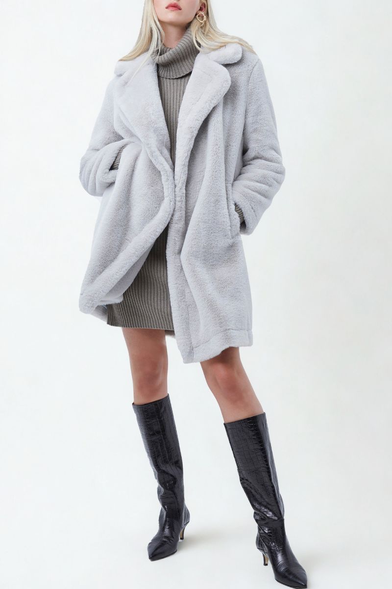 Wrap up in this beautiful stylish grey faux fur coat. This coat is a classic and will add glam and sophistication to any outfit.