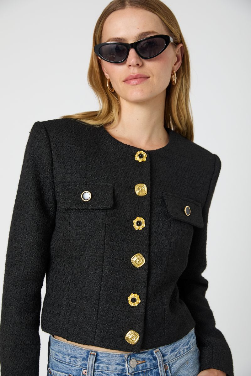 Elevate your style with this versatile black structured jacket. It can be worn in a variety of ways, especially with ornate gold buttons which exude a classier look. Pair with denim for a more laidback look or trousers for afterhours.
